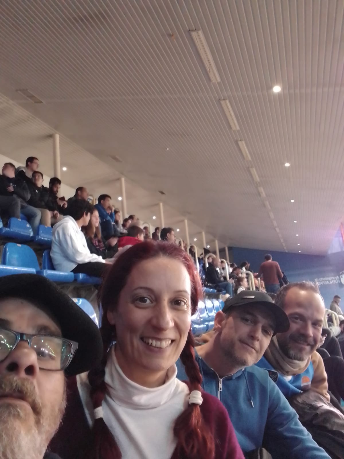 Para celebrar la victoria, vamos a cenar a un bar cercano con familia y amigos y en este ratito de disfrute se nos unen Pilar y Laurentiu que no han podido asistir al evento deportivo.