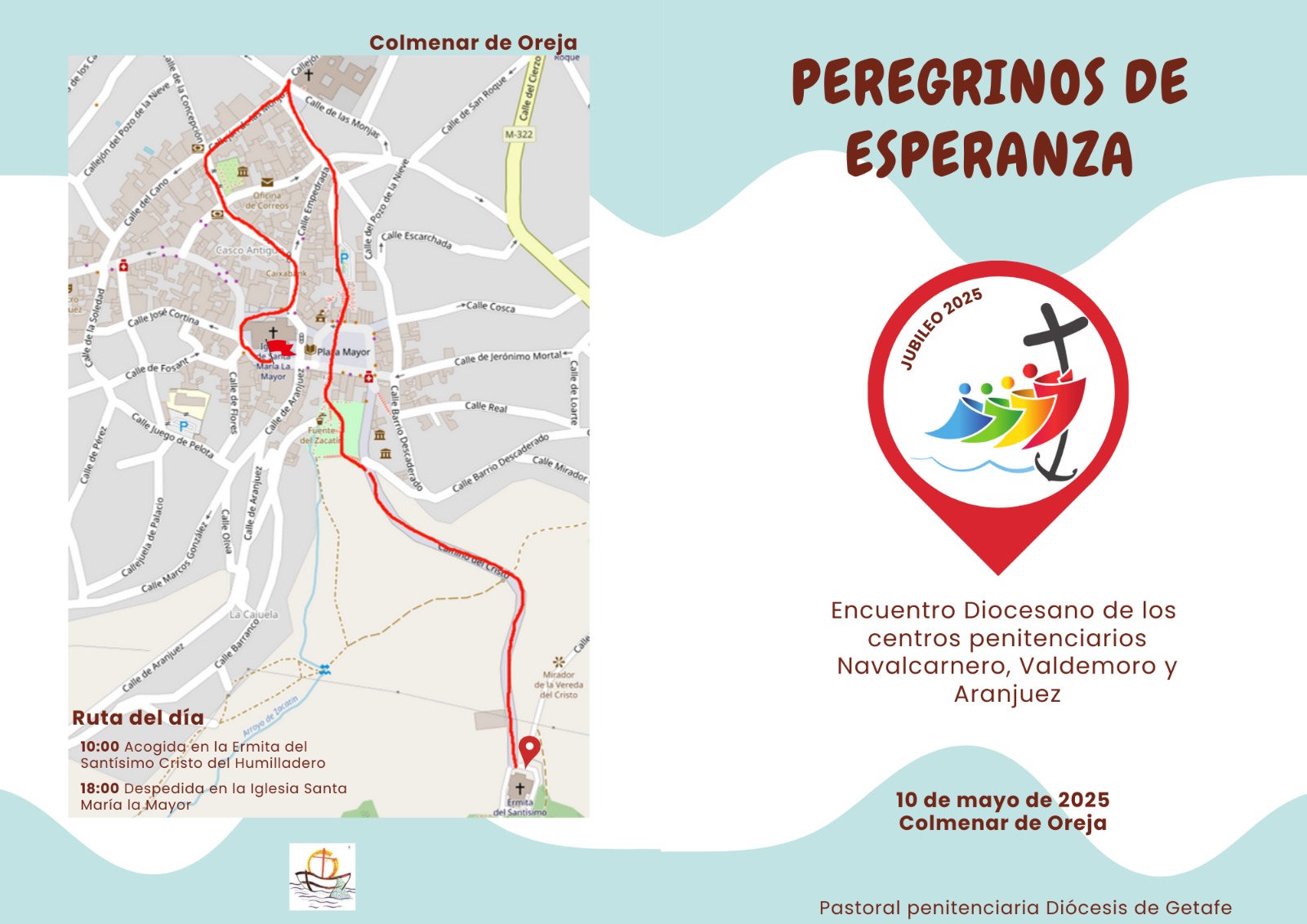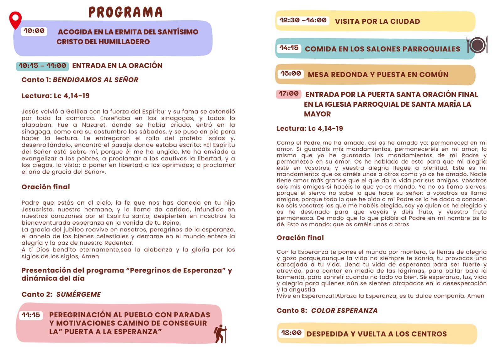 A las 11 entramos a la ermita y oramos. A continuación es la presentación del programa "Peregrinos de Esperanza" y dinámica del día, terminando con un canto.
